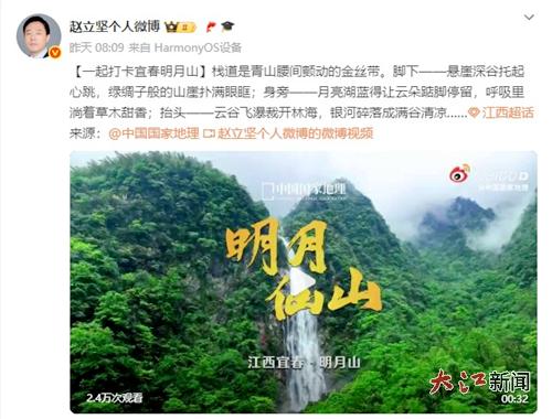 大江网/大江新闻客户端讯 记者罗鑫报道:8月4日,外交部前发言人,现任外交部边界与海洋事务司副司长赵立坚通过其个人微博,向全球推荐宜春明月山,引发网友广泛关注。网友纷纷留言:“清凉氧吧,气候宜人”“溢出屏幕的清凉”。
